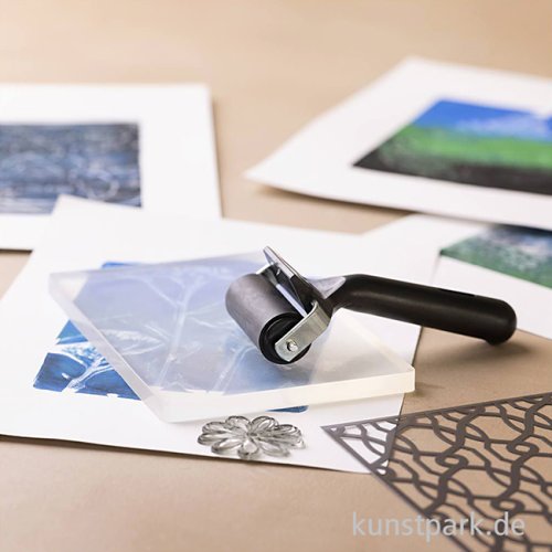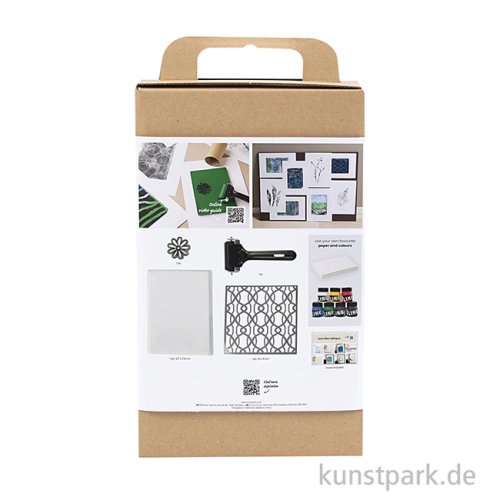 Du möchtest die angesagte Gel Printing Technik ausprobieren? In diesem Set erhältst Du alle benötigten Werkzeuge: Eine Gel Druckplatte, Schablonen, Stempel und eine Farbrolle. Du brauchst nur noch Acrylfarben zum loslegen.