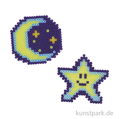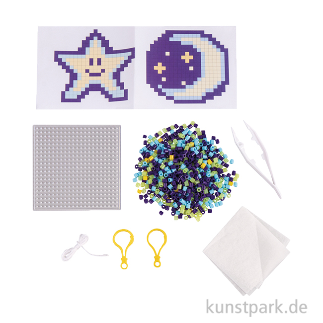 Mit dem Bügelperlen Set lassen sich kinderleicht 2 Motive gestalten. Von nachtleuchtenden Bügelperlen bis zur Steckplatte und Vorlagen beinhaltet das Set alles, um direkt loszulegen. Inklusive Pinzette, Bügelpapier, Karabinerverschlüsse und Gummifaden.