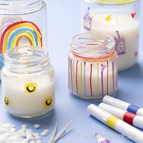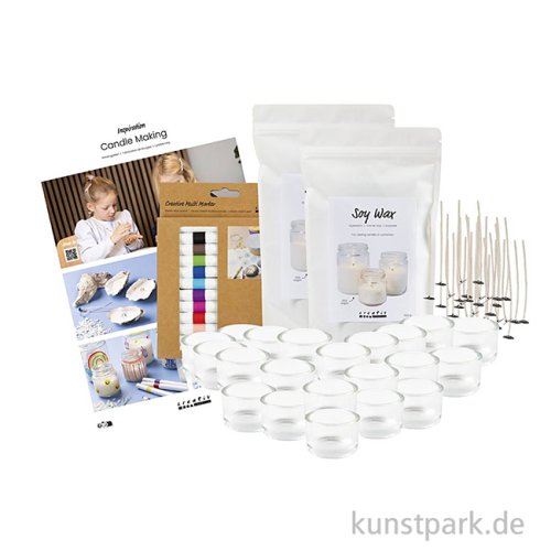 Ein extra großes DIY Set zum Kerzengießen in Gruppen! Es enthält Material für bis zu 12 Personen, die nach Herzenslust mit Sojawachs, Kerzendochten, Kerzengläsern und Markern kreativ werden können. So lassen sich kinderleicht Kerzen selber machen.