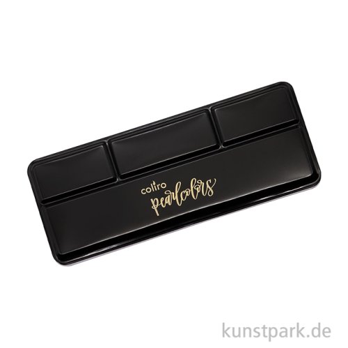 Ein schwarzes Metalletui als Leerkasten für 12 Perlglanzfarben mit je 30 mm Durchmesser von Coliro. Im Deckel ist eine praktische Mischpalette integriert. So kannst Du Deine ganz persönliche Auswahl der schimmernden Farben zusammenstellen.