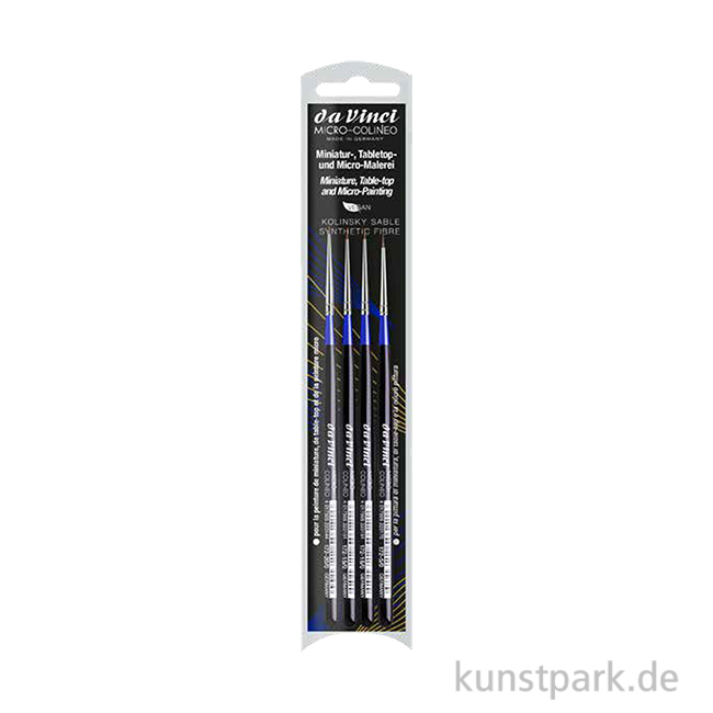 Besonders kleine Größen der da Vinci Colineo Serie mit extra kurzen Stielen – ideal für feine Details und Miniaturmaler. Die COLINEO Kunstfasern ähneln Kolinsky-Rotmarderhaaren. Sie überzeugen mit extra feinen Spitzen, hoher Elastizität und Farbaufnahme.