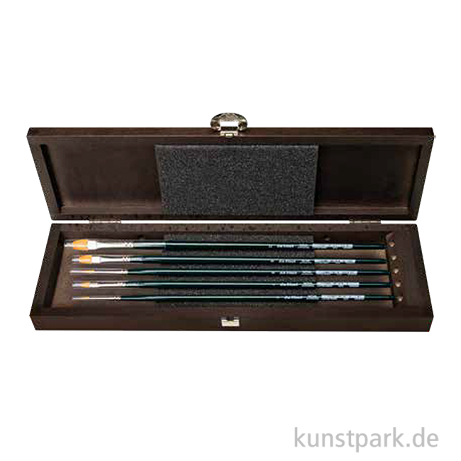 Ein hochwertiges da Vinci Nova Pinselset in einer edlen, dunkelbraun gebeizten Pinselbox aus deutschem Buchenholz. Mit integriertem Pinselhalter, Schaumstoffeinlage und Luftlöchern zur Belüftung der Pinselhaare. Ein tolles Geschenk für Acryl- und Ölmaler!