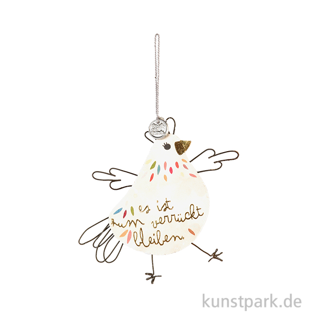 Dieses verrückte Huhn verbreitet gute Laune! Ob als Osterdeko oder kleines Mitbringsel, der bunte Anhänger aus Draht und bedruckter Pappe überzeugt mit frechen Farben und fröhlichem Blick. Ein frühlingsfrisches Kunsthandwerk Design von goold old friends.