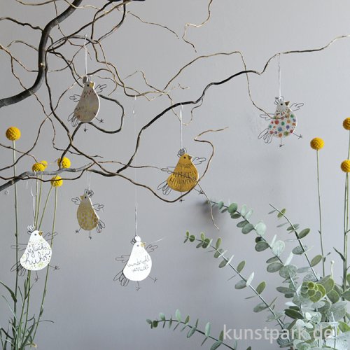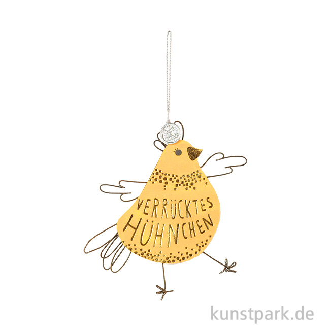 Dieses verrückte Huhn verbreitet gute Laune! Ob als Osterdeko oder kleines Mitbringsel, der bunte Anhänger aus Draht und bedruckter Pappe überzeugt mit frechen Farben und fröhlichem Blick. Ein frühlingsfrisches Kunsthandwerk Design von goold old friends.