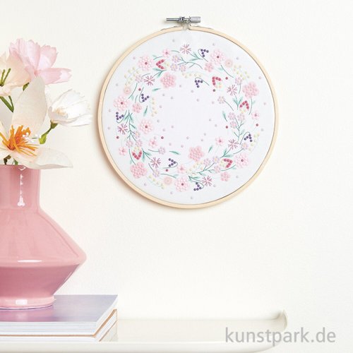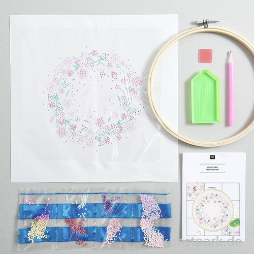 Gestalte einen funkelnden Blumenkranz! Mit Leinwand, Bambusring, Diamantsteinen, Applikationsstift und Zubehör erschaffst Du im Handumdrehen ein wunderschönes Blumenbild. Fertig gestaltet, kannst Du Dein Kunstwerk direkt im Rahmen aufhängen.