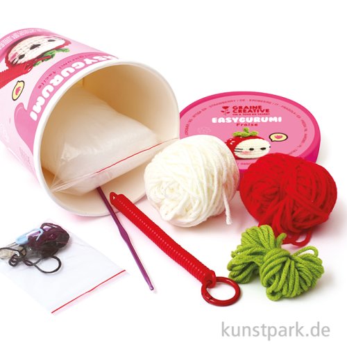 Das Amigurumi Bastelset enthält alles, was Du zum Häkeln einer niedlichen Erdbeere benötigst: Garn in diversen Farben, Häkelnadel, Maschenmarkierer, Sicherheitsaugen und -nase, Füllwatte, Schlüsselring und eine einfache Anleitung. Ideal für Anfänger!