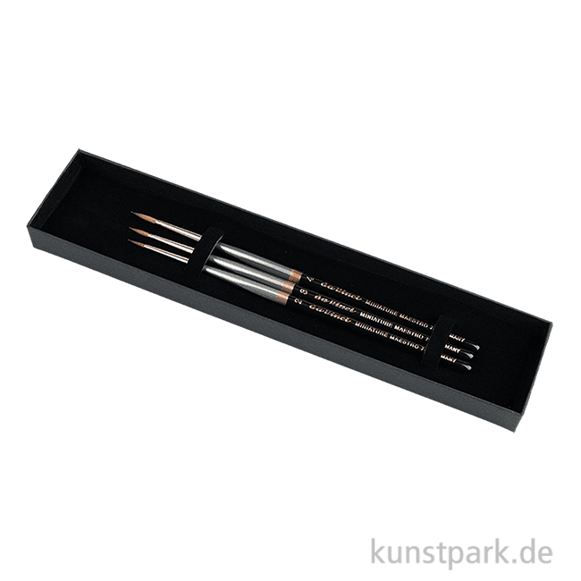 Mit der feinen, elastischen Pinselspitze der da Vinci Serie 76 gelingen präzise Details in Miniaturgemälden. Die edle Geschenkbox enthält 3 Größen der kurzen und spitzen Maestro Kolinsky Pinsel, sicher fixiert mit einer Schaumstoffeinlage.