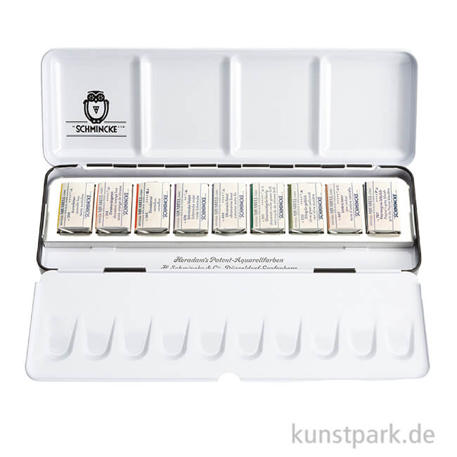 Ein limitierter HORADAM Aquarellkasten mit 9 ganzen Näpfchen im historischen Retro-Design von Schmincke. Die Farbauswahl ist inspiriert von technischen Zeichnungen und für alle Arten der Aquarellmalerei geeignet.