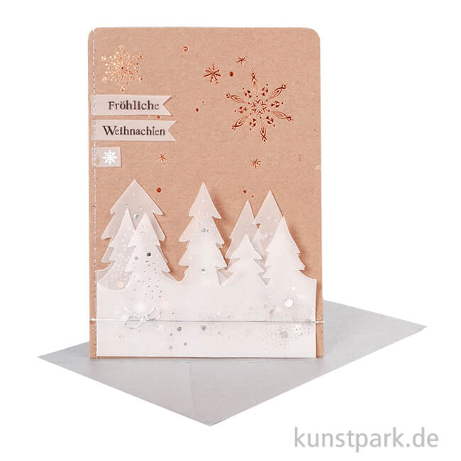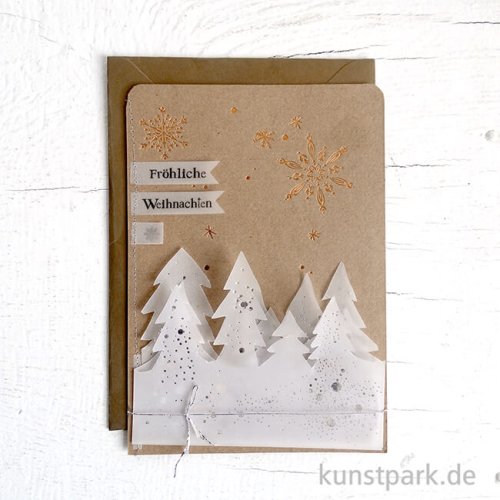 Die zarte Silhouette aus bedrucktem Transparentpapier wird im Handumdrehen zur kleinen Winterlandschaft! Mit dieser Weihnachtskarte verschenkst Du auch noch eine kleine Winterdekoration. Ein originelles Kunsthandwerk Unikat von goold old friends.