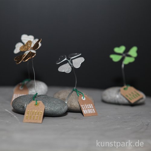 Hier wächst das Glück! Auf dem echten Stein wächst ein vierblättriges Kleeblatt aus handgebogenem Draht und Papier. Der kleine Glücksbringer eignet sich wunderbar als Präsent. Ein bezauberndes Kunsthandwerk Unikat von goold old friends.