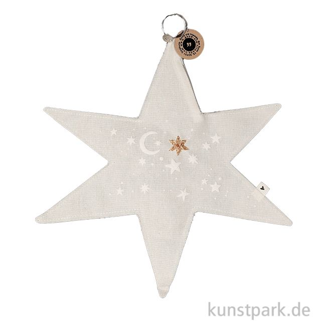 Ein festlicher Stern aus Baumwollstoff mit Druck und Stickerei. Er lässt sich wunderbar beleuchten – dank dem Reißverschluß zum Einlegen einer Lichterkette. Inklusive Metallring zum Aufhängen. Ein bezauberndes Kunsthandwerk Unikat von goold old friends.