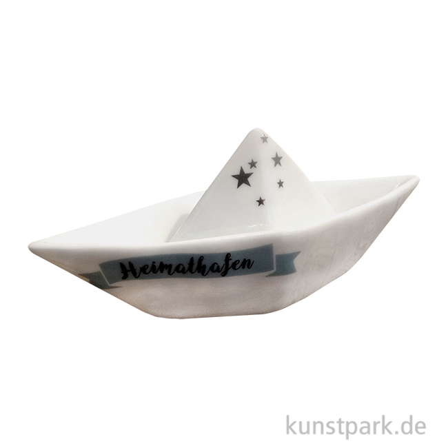 Mit diesem Boot aus feinem Porzellan kommst Du im Heimathafen an. Ob als Ablage für Kleinkram oder als persönliches Geschenk – das Traumboot überbringt gute Wünsche und verschönert Dein Zuhause. Ein bezauberndes Kunsthandwerk Design von goold old friends.