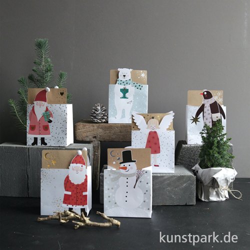 Eine liebevoll gestaltete Geschenktasche aus Papier. Die weihnachtliche Geschenktüte lässt sich blitzschnell befüllen. Inklusive bedruckter Geschenkkarte. Ein bezauberndes Kunsthandwerk Design von goold old friends.