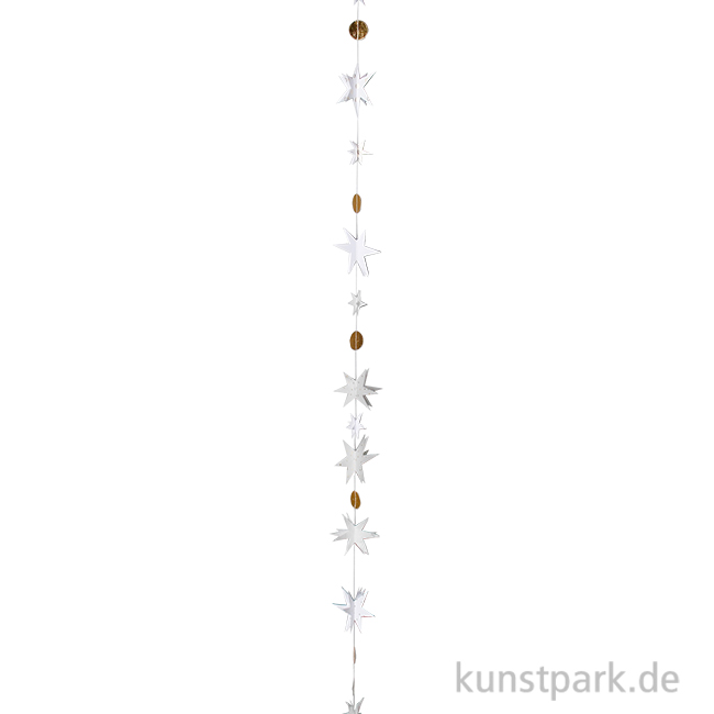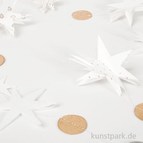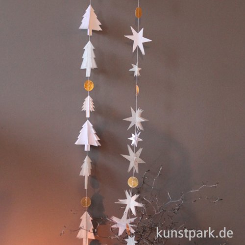 Winterlicher Papierzauber: Die lange Girlande aus verschiedenen Papieren in Weiß und Gold lässt sich dreidimensional auffalten und am Metallring aufhängen. Ein bezauberndes Kunsthandwerk Unikat von goold old friends. Hol Dir den Winterzauber nach Hause!
