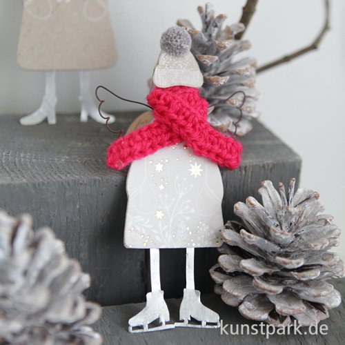 Der winterliche Wunderengel schwebt mit seinen Drahtflügeln gerne an Ästen oder Fenstern. Sein Winterkleid aus Pappe wird von einer flauschigen PomPom Mütze und einem gestrickten Schal ergänzt. Ein bezauberndes Kunsthandwerk Unikat von goold old friends.