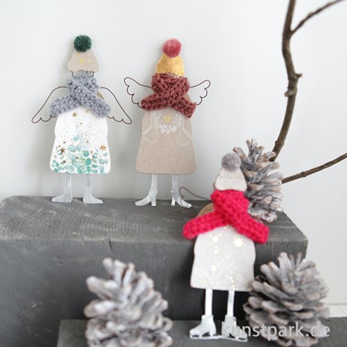 Der winterliche Wunderengel schwebt mit seinen Drahtflügeln gerne an Ästen oder Fenstern. Sein Winterkleid aus Pappe wird von einer flauschigen PomPom Mütze und einem gestrickten Schal ergänzt. Ein bezauberndes Kunsthandwerk Unikat von goold old friends.
