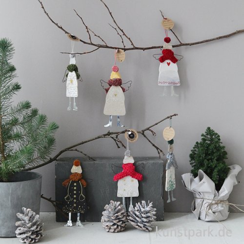 Der winterliche Wunderengel schwebt mit seinen Drahtflügeln gerne an Ästen oder Fenstern. Sein Winterkleid aus Pappe wird von einer flauschigen PomPom Mütze und einem gestrickten Schal ergänzt. Ein bezauberndes Kunsthandwerk Unikat von goold old friends.