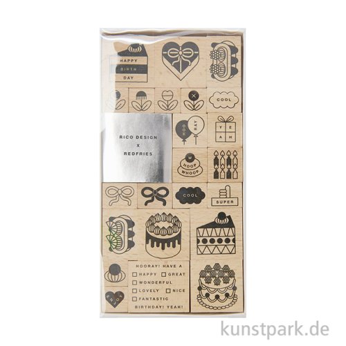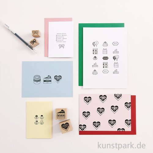 Ein festliches Stempelset mit niedlichen Torten Designs und einem schwarzen Stempelkissen. So kannst Du Geburtstagskarten, Geschenke, Journals und Scrapbooks im Handumdrehen aufhübschen. Das Set enthält 23 verschiedene Motive.