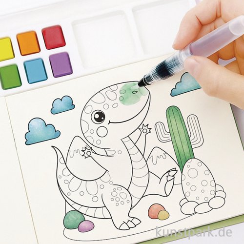 Einfacher Malspaß für Kinder! Der Malblock enthält 20 Karten mit 29 lustigen Dino Motiven auf extra dickem Papier, durch das die Farben nicht durchscheinen. Die 6 Wasserfarben können mit dem Wassertankpinsel auf den beiden Mischflächen gemischt werden.