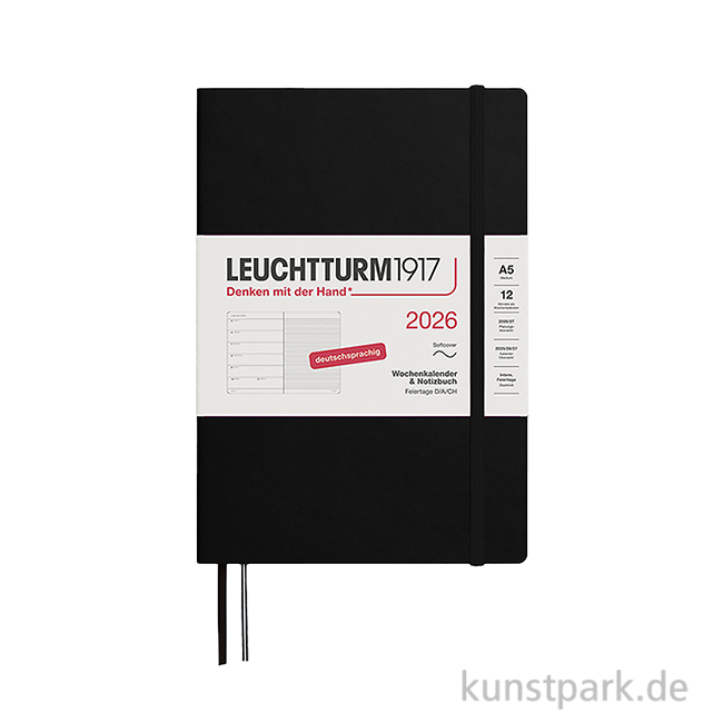 Leuchtturm Wochenkalender und Notizbuch mit Softcover-Einband und säurefreiem 80 g/m² Papier im Format DIN A5. Ein praktischer Planer für 2026 mit Feiertagen, Ferien, 3-Jahresübersicht, Projektplan, Falttasche, Lesebändchen und Archivierungsaufklebern.