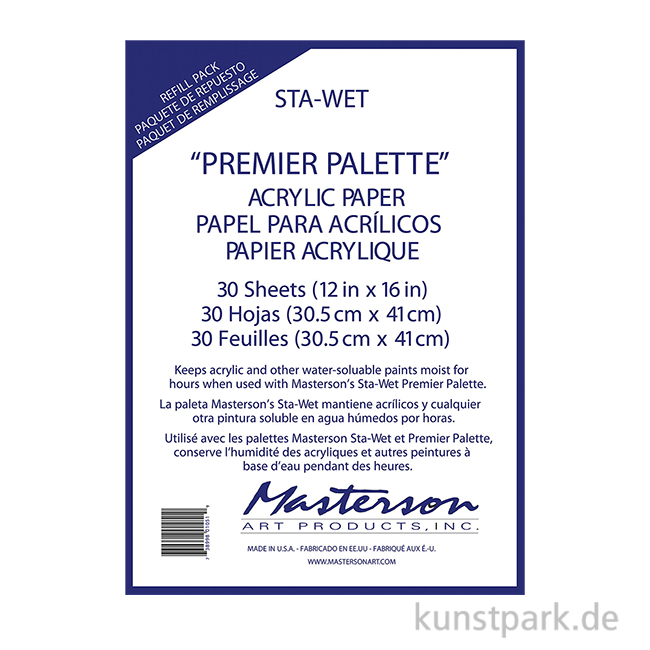 Das spezielle Sta-Wet-Palettenpapier hält Acrylfarben und andere wasserbasierte Farben lange vermalbar, indem es die Feuchtigkeit vom Sta-Wet Schwamm gleichmäßig auf die Farben in der Palette verteilt. Das Papier ist durchlässig und wiederverwendbar.