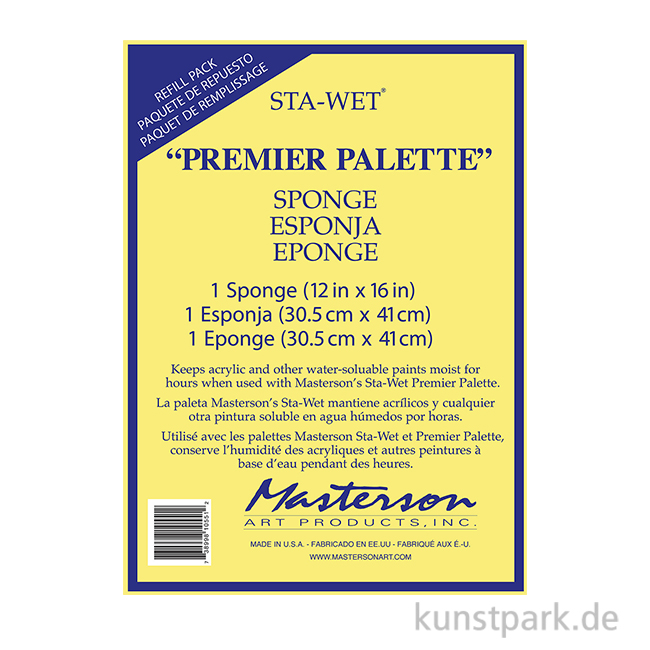 Der Sta-Wet Schwamm hält wasserlösliche Farben in der zugehörigen Nasspalette lange feucht und vermalbar. Der Zelluloseschwamm leitet gleichmäßig Feuchtigkeit an das Palettenpapier und bewahrt die Farben so vor dem Austrocknen.