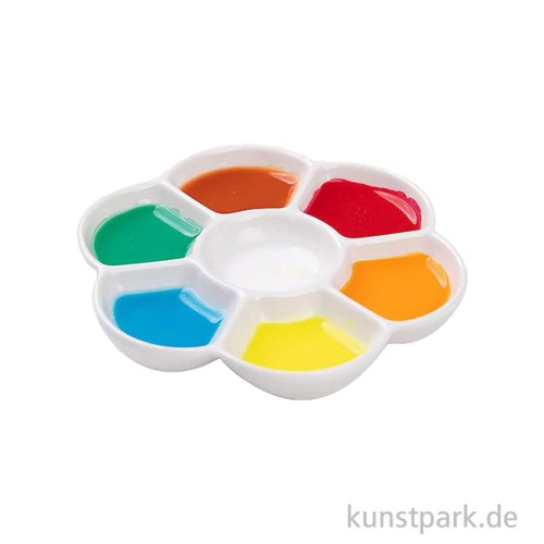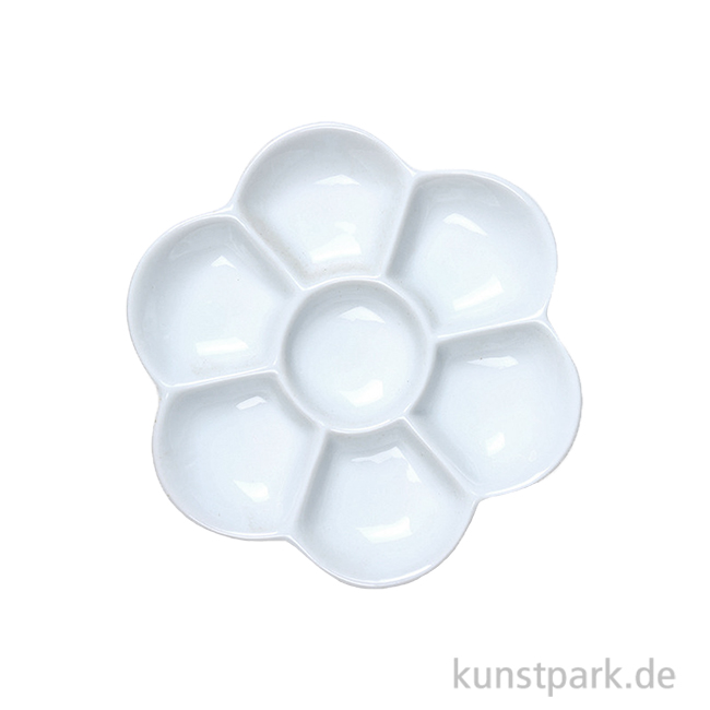 Eine blumenförmige Mischpalette aus glasiertem Porzellan mit 7 tiefen Mischmulden. Die Keramik Mischpalette eignet sich besonders gut für Gouache und Aquarellfarben, da diese Farben auf der glatten Oberfläche lange feucht und gut mischbar bleiben.