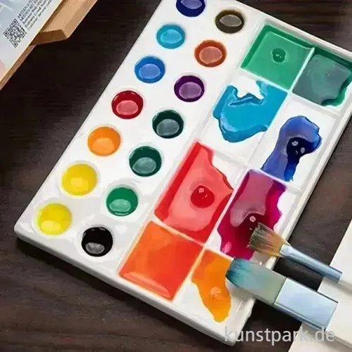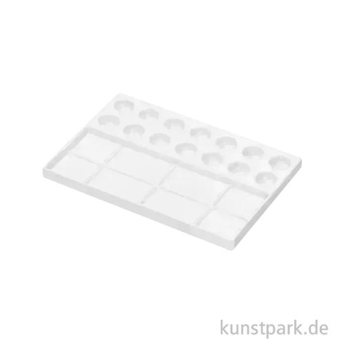 Eine hochwertige Mischpalette aus glasiertem Porzellan mit 22 Mischmulden. Die Keramik Mischpalette eignet sich besonders gut für Aquarell und wasserbasierte Farben, da diese auf der glatten Oberfläche lange feucht und gut mischbar bleiben.