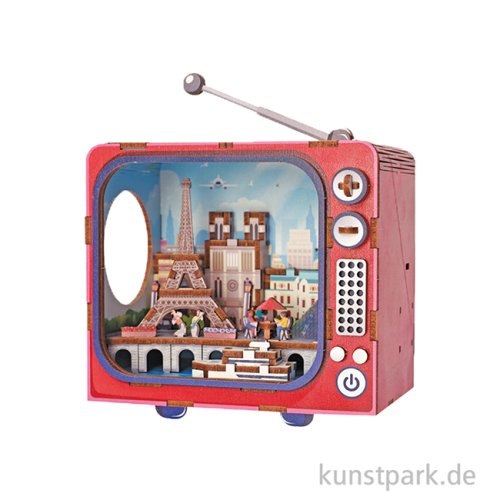 Baue Dir Dein eigenes Fenster nach Paris! Aus 100 vorgeschnittenen Holzteilen entsteht im Handumdrehen ein nostalgischer Mini-TV mit Eiffelturm, Cafés und stimmungsvollem LED-Licht. Inklusive Kleber und Anleitung.
