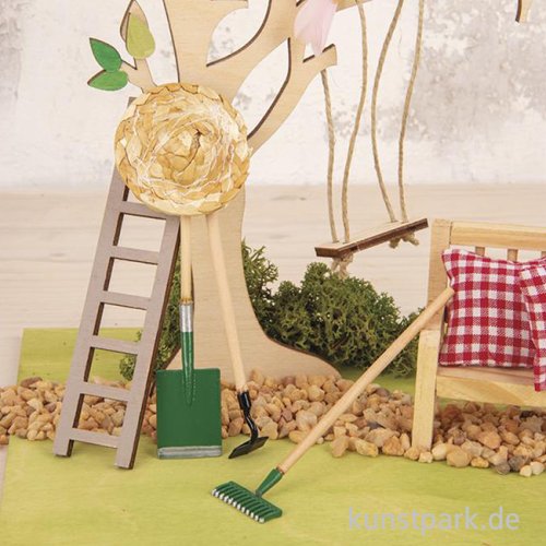 Diese dekorativen Gartenwerkzeuge im Miniformat besitzen eine realistische Optik und eignen sich prima als Dekoration für Miniaturgärten, Puppenhäuser oder Wichteltüren. Sie lassen sich wunderbar mit passender Miniatur Deko kombinieren.