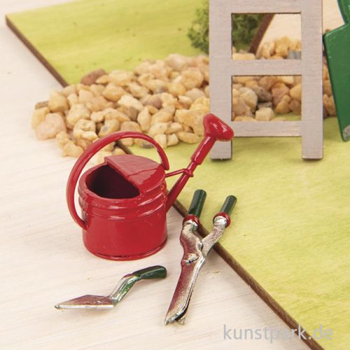 Infos über Miniatur Deko Set, Gießkanne + Gartenwerkzeuge, 3-teilig, 2,8-4 cm