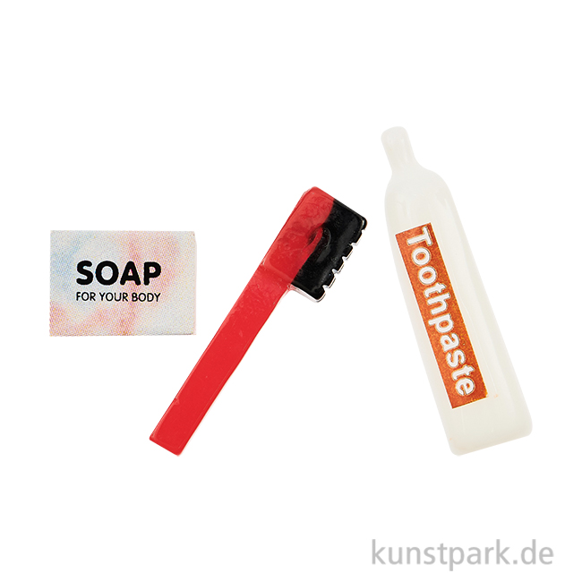 Das dekorative Zahnpflegeset im Miniformat besitzt eine realistische Optik und eignet sich wunderbar als Dekoration für kleine Miniatur Badezimmer, Modellbau oder Puppenhäuser. Es lässt sich prima mit passender Miniatur Deko kombinieren.