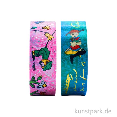Verspielte Pippi Langstrumpf Illustrationen und Muster verzieren diese hochwertigen Washi Tapes mit edlen Folienakzenten – bei uns erhältst Du die zauberhaften Deko-Klebebänder im aufeinander abgestimmten Doppelpack.