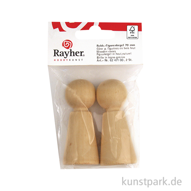 7 cm hohe Figurenkegel aus naturbelassenem Holz zum Selbstgestalten. Erwecke Deine Figuren mit beliebigen Accessoires wie Farben, Wackelaugen, Woll-Haaren und Filz-Kleidung zum Leben. Die Packung enthält 2 Stück.