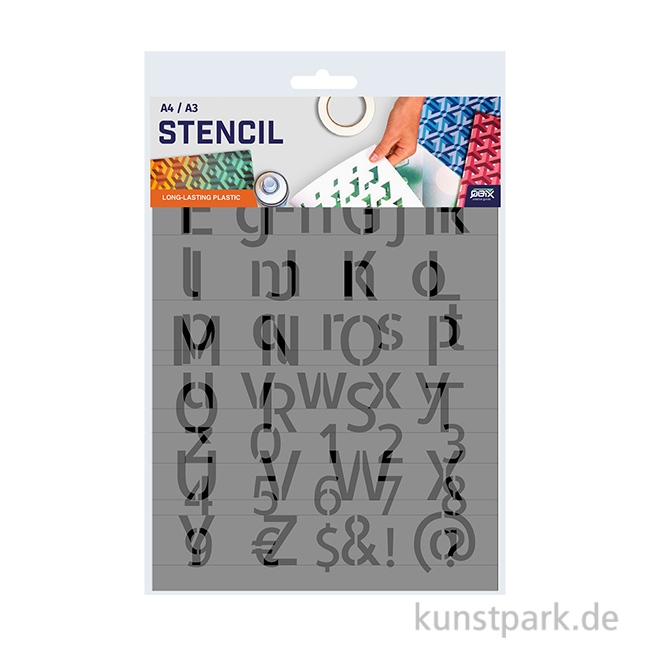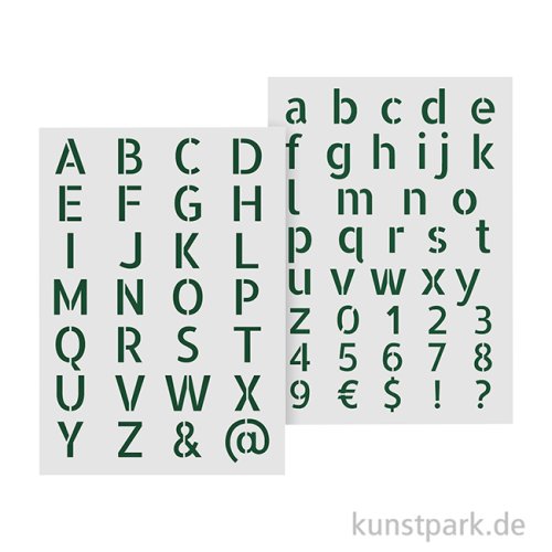 Moderne Groß- und Kleinbuchstaben als Schablonen Set mit Zahlen und Sonderzeichen. Die hochwertigen QBIX Schablonen sind aus 0,3 mm semitransparentem Mylar-Kunststoff lasergeschnitten. Sie sind flexibel, langlebig und für alle Farben geeignet.