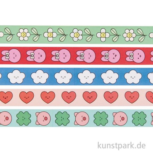 5 verspielte Washi Tapes mit niedlichen Chingu Motiven im Set. Die Deko Klebebänder sind mit glänzenden Hot Foil Akzenten veredelt. Ideal zum Verzieren von Karten, Geschenken, Scrapbooks und Journals. Jede Rolle Tape ist 15 mm breit und 10 Meter lang.