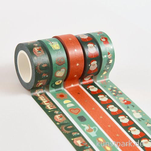 Weihnachtliche Washi Tapes mit 5 verschiedenen Motiven im Set. Die Deko Klebebänder sind mit glänzenden Hot Foil Akzenten veredelt. Ideal zum Verzieren von Karten, Geschenken, Scrapbooks und Journals. Jede Rolle Tape ist 15 mm breit und 10 Meter lang.