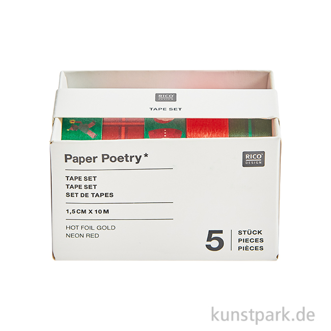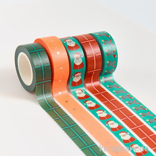 Weihnachtliche Washi Tapes mit 5 verschiedenen Motiven im Set. Die Deko Klebebänder sind mit glänzenden Hot Foil Akzenten veredelt. Ideal zum Verzieren von Karten, Geschenken, Scrapbooks und Journals. Jede Rolle Tape ist 15 mm breit und 10 Meter lang.