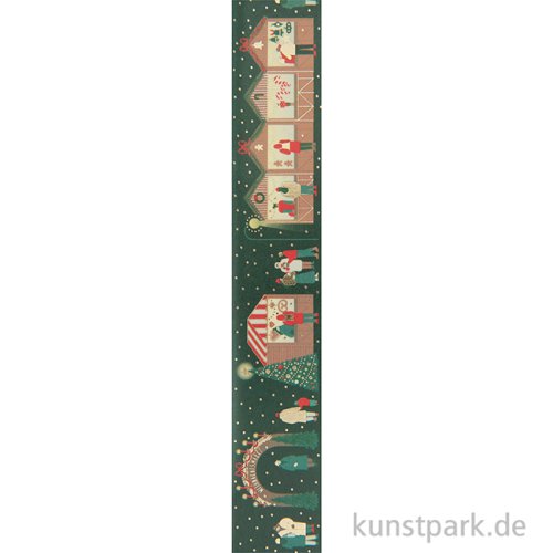 Weihnachtliches Washi Tape mit Weihnachtsmarkt Design. Das Deko Klebeband ist mit Effektfolie veredelt. Es eignet sich wunderbar zum Verzieren von Karten, Geschenken, Scrapbooks und Journals. Die Rolle ist 30 mm breit und 10 Meter lang.