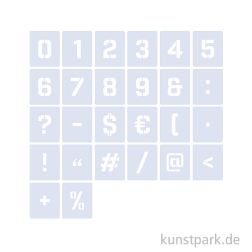 Alle Zahlen und Sonderzeichen als Schablonen Set mit 26 verschiedenen Motiven! Die hochwertigen QBIX Schablonen sind aus 0,5 mm semitransparentem Mylar-Kunststoff lasergeschnitten. Das Material ist flexibel, langlebig und für alle Farben geeignet.