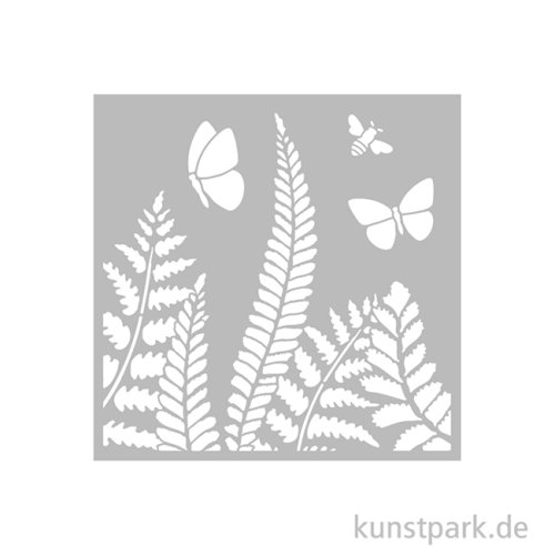 Eleganter Farn und Schmetterlinge schmücken diese 18 x 18 cm große Schablone aus flexiblem Kunststoff. Mit ihrer Hilfe kannst Du das Design in Deinen Lieblingsfarben auf nahezu jede Oberfläche übertragen.