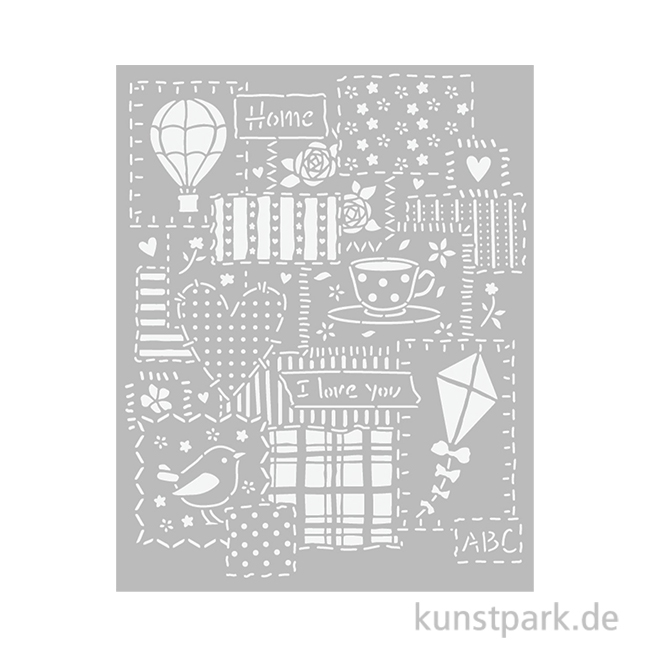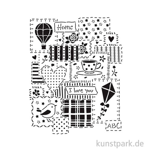 Verspielte Patchwork Muster schmücken diese 20 x 25 cm große Schablone aus flexiblem Kunststoff. Mit ihrer Hilfe kannst Du das Design in Deinen Lieblingsfarben auf nahezu jede Oberfläche übertragen.