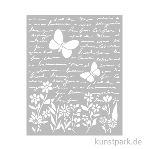 Filigrane Schriften, Blumen und Schmetterlinge ziert diese 20 x 25 cm große Schablone aus flexiblem Kunststoff. Mit ihrer Hilfe kannst Du das Design in Deinen Lieblingsfarben auf nahezu jede Oberfläche übertragen.