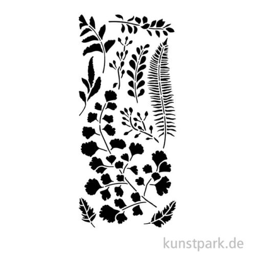 Elegante Blätter und Pflanzen zieren diese 12 x 25 cm große Schablone aus flexiblem Kunststoff. Mit ihrer Hilfe kannst Du das Design in Deinen Lieblingsfarben auf nahezu jede Oberfläche übertragen.