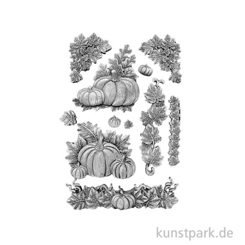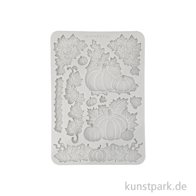 Eine flexible Silikonform mit herbstlichen Kürbis Designs. Du kannst die einzelnen Motive dreidimensional ausgießen oder in eine Modelliermasse hinein prägen. Die Form ist für diverse Gieß- und Modelliertechniken geeignet.