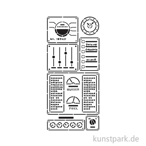 Diverse Bedienelemente von Maschinen zieren diese 12 x 25 cm große Schablone aus flexiblem Kunststoff. Mit ihrer Hilfe kannst Du das Design in Deinen Lieblingsfarben auf nahezu jede Oberfläche übertragen.