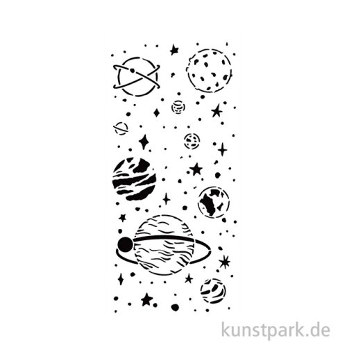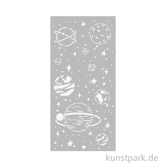 Ein Sternenhimmel voller Planeten ziert diese 12 x 12 cm große Schablone aus flexiblem Kunststoff. Mit ihrer Hilfe kannst Du das Design in Deinen Lieblingsfarben auf nahezu jede Oberfläche übertragen.