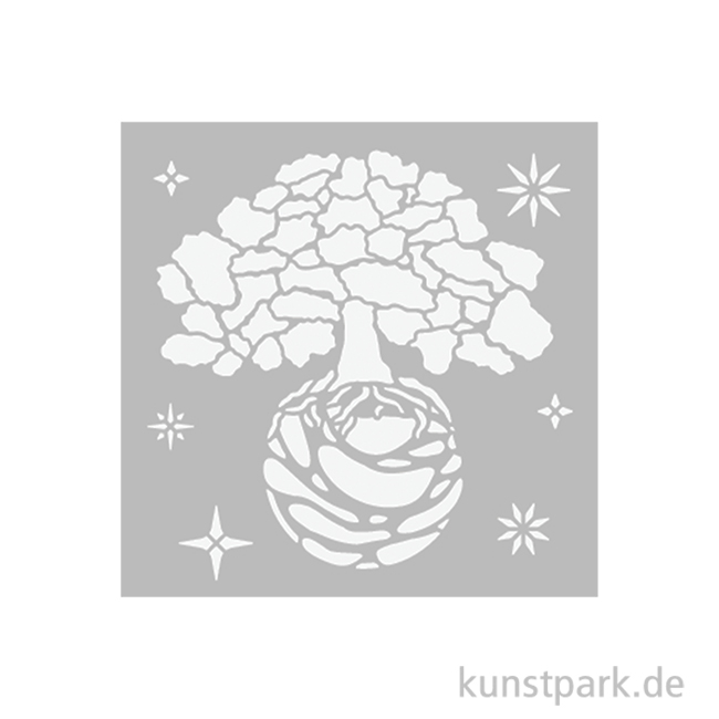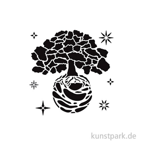Ein verträumtes Weltbaum Motiv ziert diese 12 x 12 cm große Schablone aus flexiblem Kunststoff. Mit ihrer Hilfe kannst Du das Design in Deinen Lieblingsfarben auf nahezu jede Oberfläche übertragen.