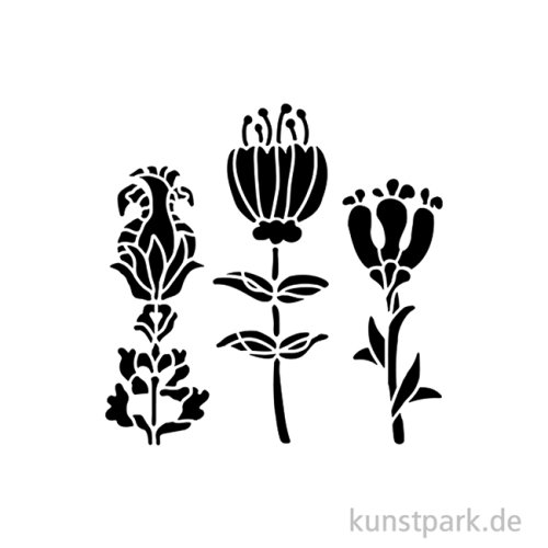 Filigrane Blumen schmücken diese 12 x 12 cm große Schablone aus flexiblem Kunststoff. Mit ihrer Hilfe kannst Du das Design in Deinen Lieblingsfarben auf nahezu jede Oberfläche übertragen.