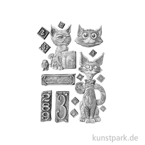 Eine flexible Silikonform mit verspielten Vintage Katzen Designs. Du kannst die einzelnen Motive dreidimensional ausgießen oder in eine Modelliermasse hinein prägen. Die Form ist für diverse Gieß- und Modelliertechniken geeignet.